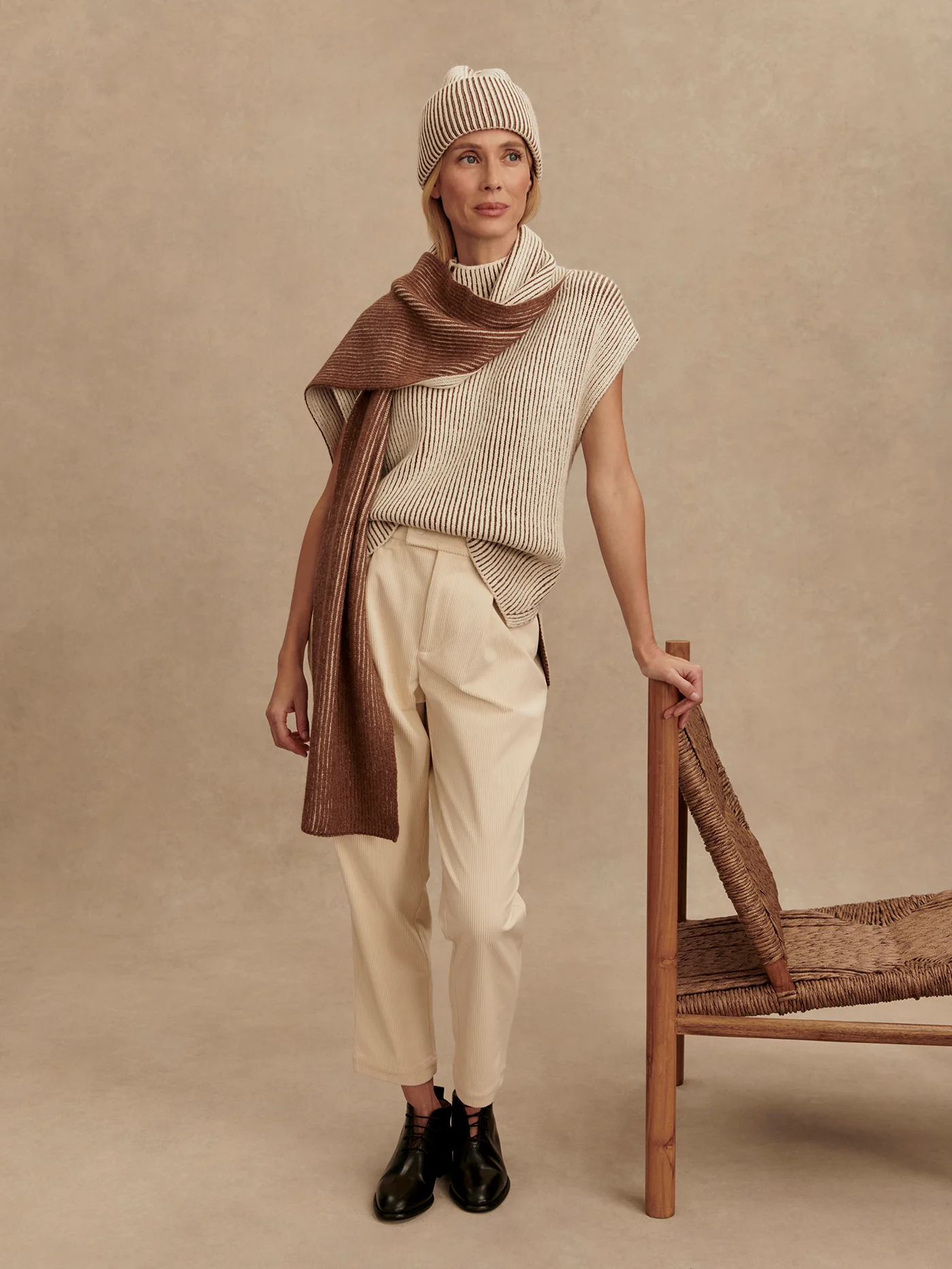 A thoroughly modern statement tank to elevate your looks. The plated Alpaca blend yarn gives the Lauren an elegant two-tone effect, complete with a stepped hem, side splits, and fashioning details. The relaxed fit is shaped with a grown-on neck and sleeves. Style with the matching Dionne beanie and Deville scarf for a coordinated look.