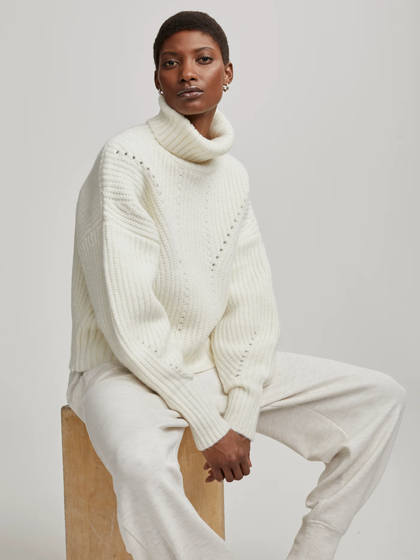 Wrap yourself in winter elegance with our cropped Rogan knit, featuring delicate pointelle stitching, roll neck, and voluminous sleeves. Designed with a boxy silhouette in soft slub knit, it’s the perfect addition to your sweater collection.